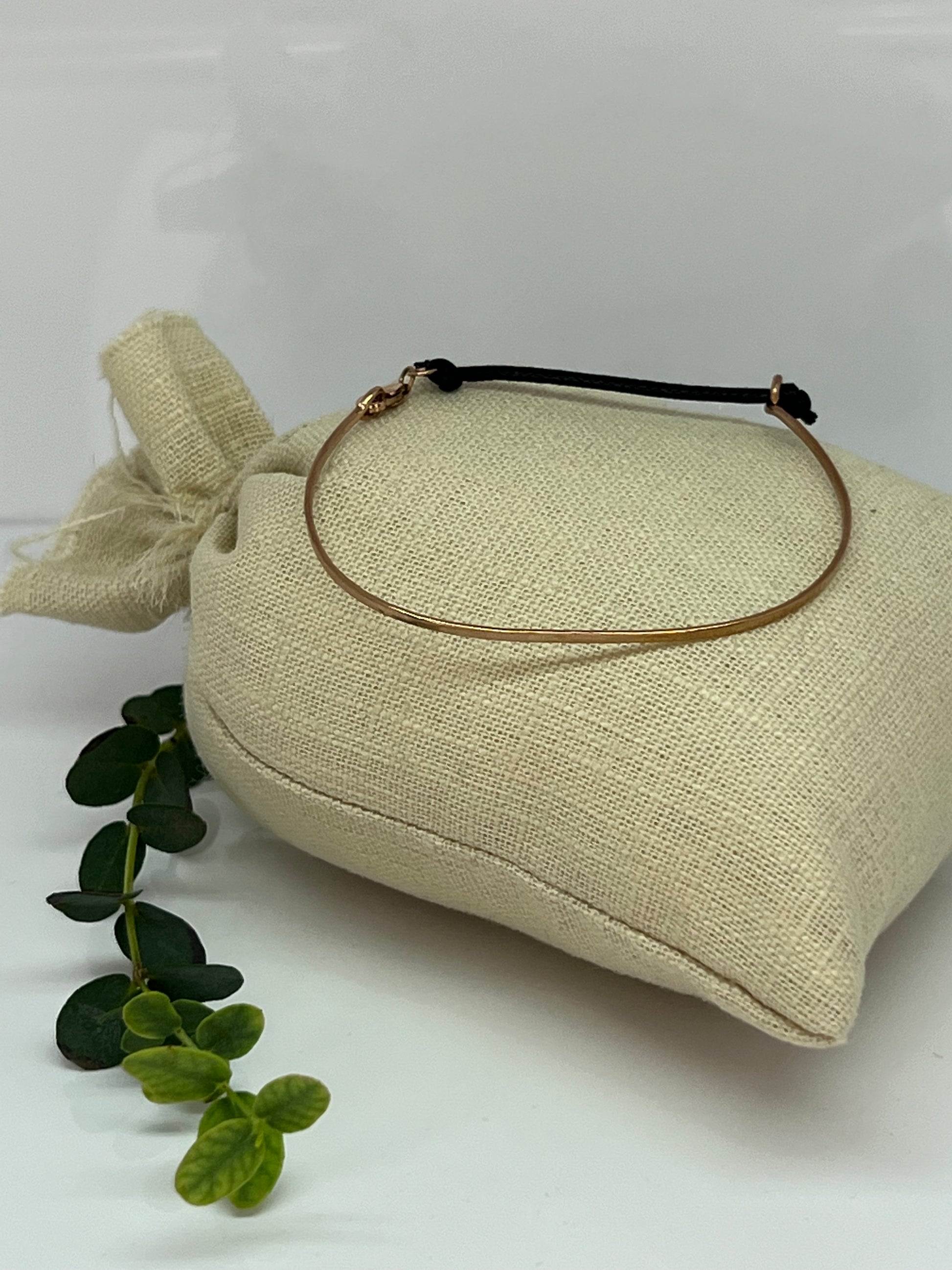 Bracciale rigido in oro rosa a titolo 375 con laccetto di stoffa nero.